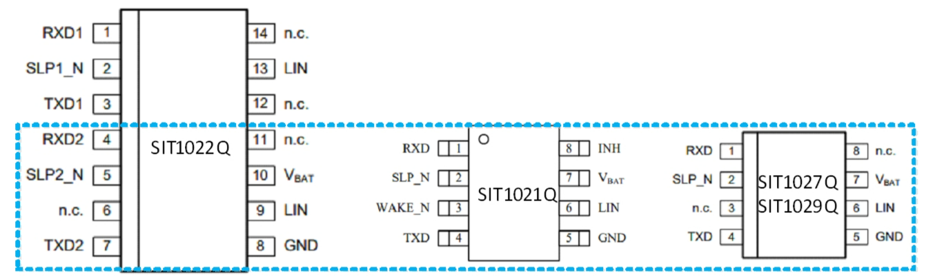 SIT1022Q包含兩個(gè)LIN收發(fā)器通道,每個(gè)通道提供獨(dú)立的模式控制(引腳SLP1_N、SLP2_N為模式控制引腳),為了支持LIN電路板設(shè)計(jì)的可擴(kuò)展性,SIT1022Q固定的下半部分兼容單通道LIN收發(fā)器,如SIT1021Q,SIT1027Q和SIT1029Q,這使得LIN軟件驅(qū)動(dòng)程序可以重用,其SOP封裝和DFN封裝如圖6,引腳功能如圖7。