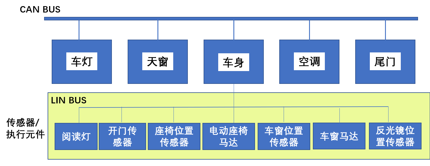 作為解決此問題的對(duì)策,引入了多點(diǎn)通信協(xié)議。通過引入CAN多點(diǎn)通信協(xié)議,可以在不增加配線的前提下接入更多的傳感器和執(zhí)行器。但是,對(duì)于傳感器和執(zhí)行器的局域網(wǎng)絡(luò)通信不需要像動(dòng)力系統(tǒng)和底盤系統(tǒng)那樣對(duì)于通信速率和可靠性上有很高的要求,從成本來看未必是最合適的設(shè)計(jì),于是就有了LIN(Local Interconnect Network),通過采用LIN可以構(gòu)筑簡(jiǎn)單、低成本的局域網(wǎng)絡(luò),如圖3所示。
