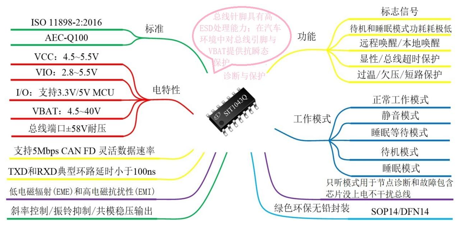 遠程喚醒:喚醒源來源于自身ECU節(jié)點所在的網(wǎng)絡(luò)報文,該節(jié)點可以處于完全睡眠狀態(tài),一般無能量消耗。這種喚醒的特點:只有當(dāng)CAN收發(fā)器監(jiān)控到總線電平變化或者特定報文時,就會接通CAN芯片INH引腳控制LDO給到主控芯片上電,從而喚醒ECU節(jié)點。芯力特公司的SIT1043Q CAN收發(fā)器兼容以上兩種喚醒功能,下面我們來對SIT1043Q做個簡單的介紹。